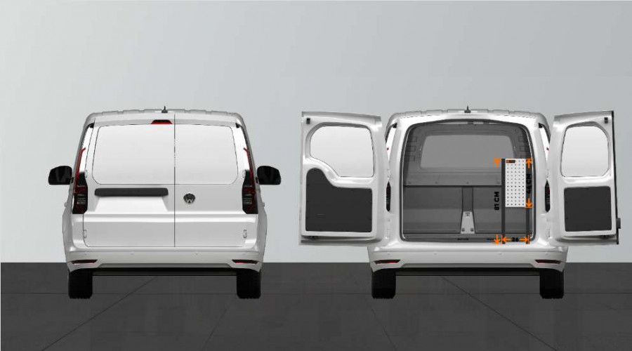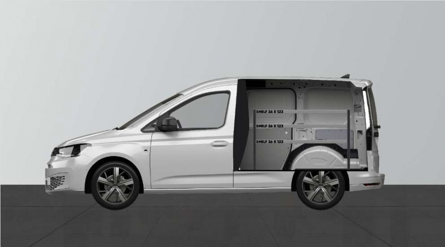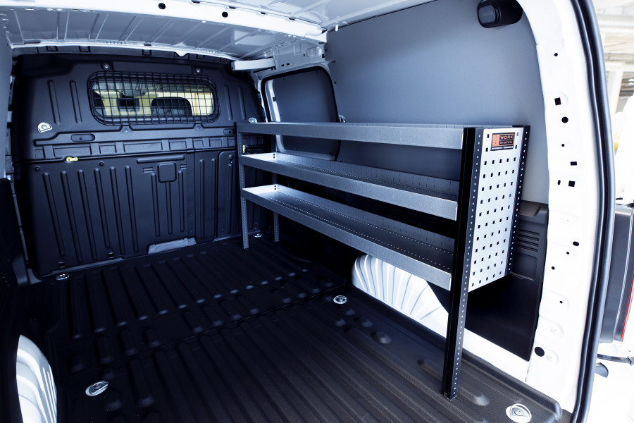 A van rack for users who want to maintain the width of their VW Caddy Cargo & Ford Connect L1. The shelf is only 262.5 mm deep and offers good storage options for a smaller assortment, such as packs of screws and smaller products for caretakers, electricians, and plumbers. Choose our modular boxes as a smart accessory to increase the shelf’s storage capacity. Adding our Smartboxes to the side panels is also a popular option for maximizing storage space.