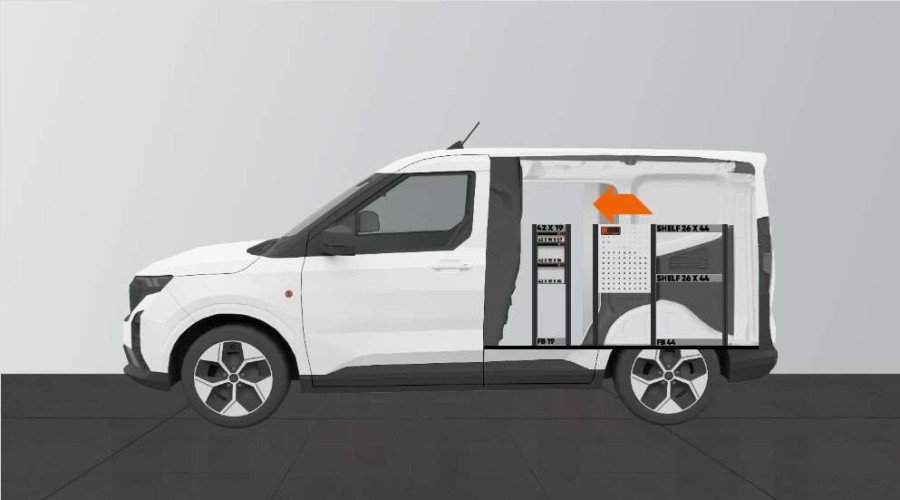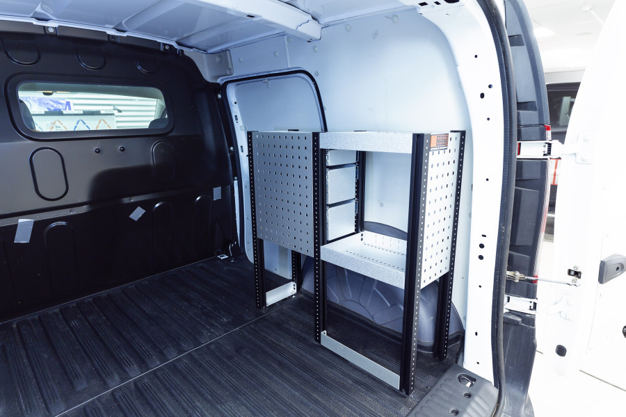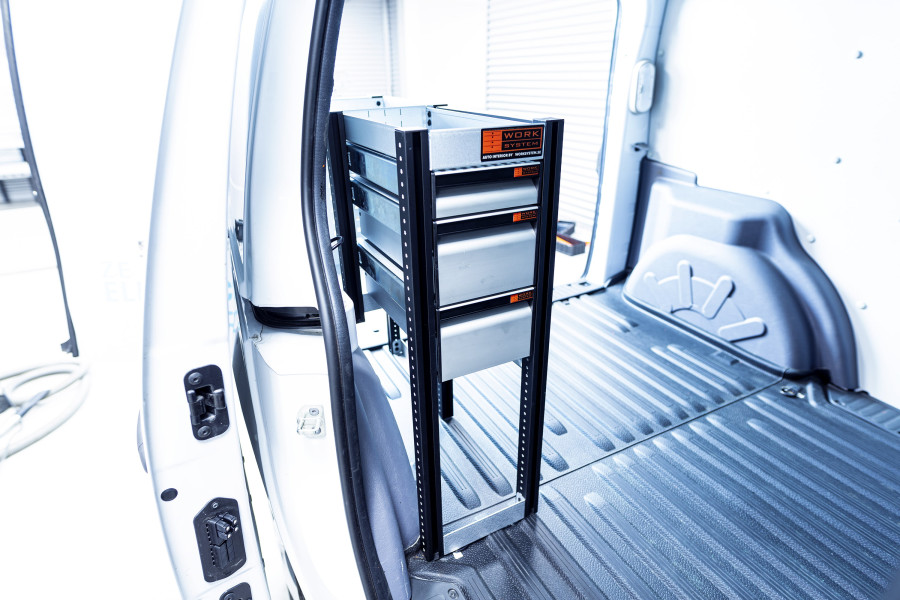 Do you need to maximise your Ford Courier L1with an additional shelf? This is a rack that allows you to maintain the width of the van as the shelf is 260 mm deep. The rack has 4 drawers on ball bearing rails of varying sizes to create different storage options. These can be supplemented with insert kits or drawer inserts to properly organise smaller assortments. The shelf space behind the drawer unit is often enhanced with modular boxes. Distributed load weight in the drawers is 35 kg each. The internal dimensions of the drawers are (mm) W-163, D-387, H-60 and H-130.