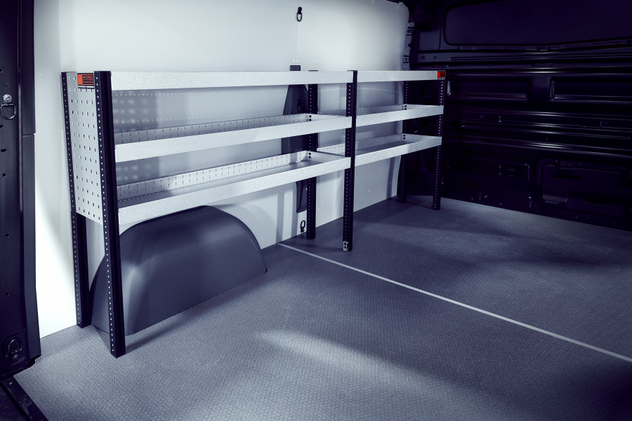 A van rack for users who want to maintain the width of their Peugoet Expert, Renault Jumpy, Opel Vivaro, Fiat Scudo & Toyota ProAce. The shelf is only 262.5 mm deep and offers good storage options for a smaller assortment, such as packs of screws and smaller products for caretakers, electricians, and plumbers. Choose our modular boxes as a smart accessory to increase the shelf’s storage capacity. Adding our Smartboxes to the side panels is also a popular option for maximizing storage space.