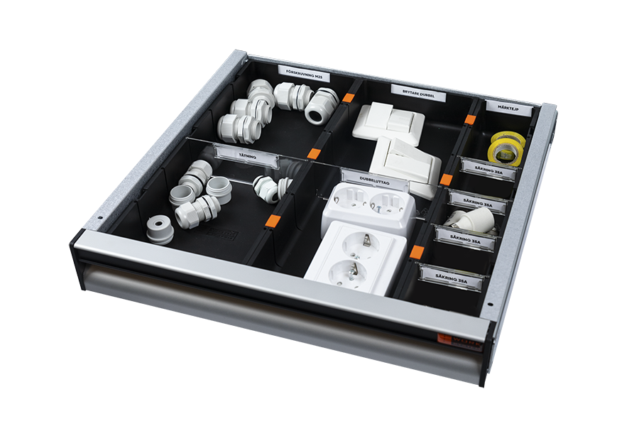 Very practical insert tray for your smaller parts and assortment. Insert trays are installed and fit in all our drawers. Supplement with dividers to be able to divide the insert tray into several compartments and different depths. Each insert tray and divider has a label compartment to provide the best conditions for order in your transport vehicle. Available in two different heights of 52.5 mm and 105 mm, and in four different widths of 70 mm, 80 mm, 105 mm and 157 mm. Made of recycled PP Plastic.