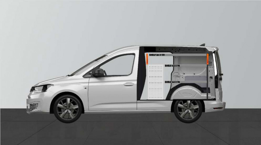 This is one of the most popular systems for VW Caddy Cargo & Ford Connect L1 with a side door on the side where the shelf is. The shelf provides good storage options for tool cases and machines, as well as smaller assortments. You get a drawer unit with 5 drawers of varying sizes to give each item its own space. Behind the drawers is a tool panel for extra hanging options in the van. The drawers that go on ball bearing rails are often supplemented with our new drawer inserts and dividers to create the best structure. Adding our Smartboxes to the side panels is also a popular option for maximising storage space.