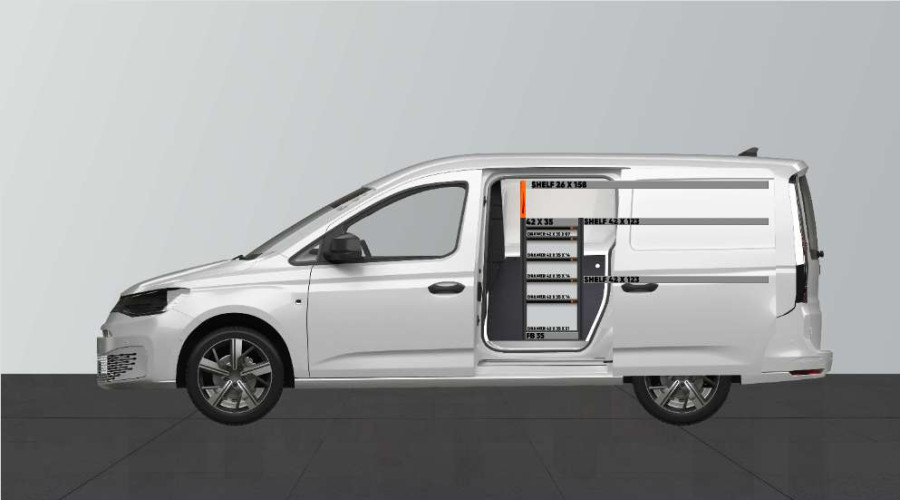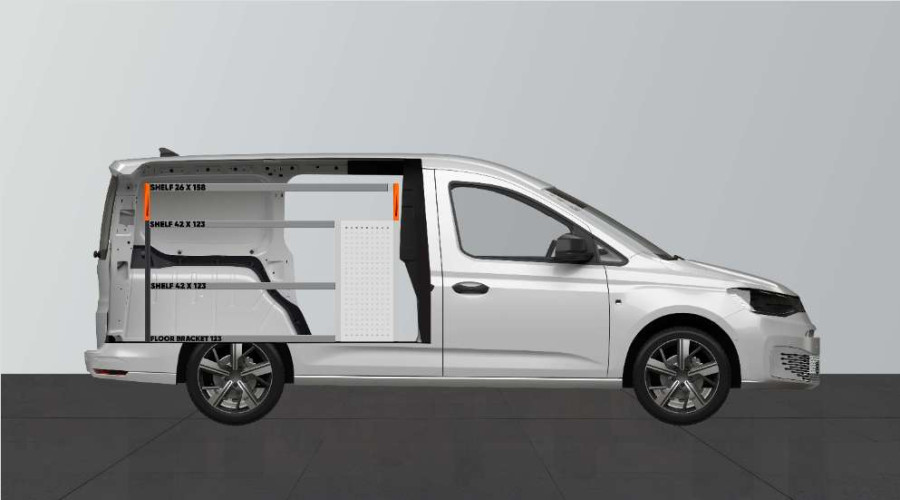 This is one of the most popular systems for VW Caddy Cargo & Ford Connect L2 with a side door on the side where the shelf is. The shelf provides good storage options for tool cases and machines, as well as smaller assortments. You get a drawer unit with 5 drawers of varying sizes to give each item its own space. Behind the drawers is a tool panel for extra hanging options in the van. The drawers that go on ball bearing rails are often supplemented with our new drawer inserts and dividers to create the best structure. Adding our Smartboxes to the side panels is also a popular option for maximising storage space.