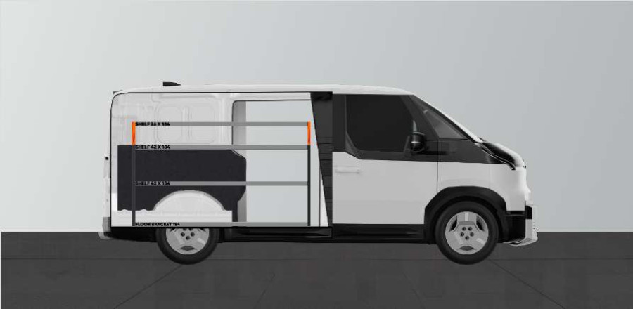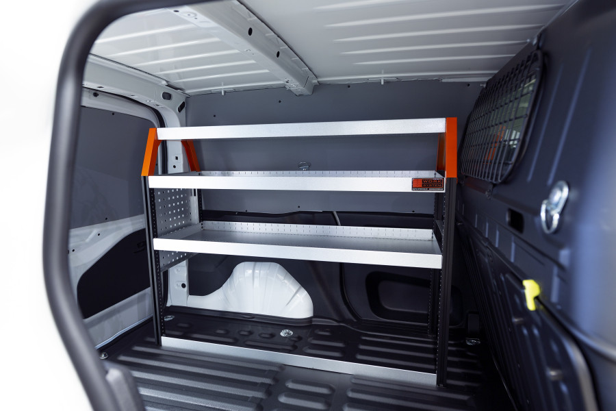 A van rack for your KIA PV5 L2H1 that provides good storage options for tool cases and machines as well as smaller assortments. The shelves of the racking have a depth of 420 mm so most tool cases on the market fit perfectly. The top shelf of 262.5 mm is often supplemented with our modular boxes so smaller assortments have their own space. The side panels offer room for additional accessories like Smartboxes and hooks.