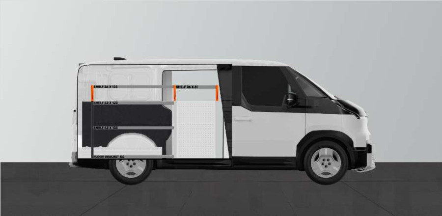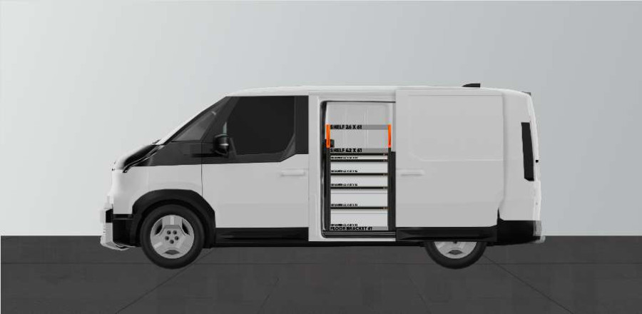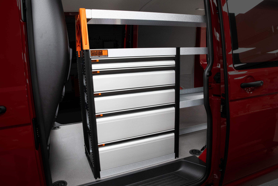 This is one of the most popular systems for Kia PV5 L2H1 with a side door on the side where the shelf is. The shelf provides good storage options for tool cases and machines, as well as smaller assortments. You get a drawer unit with 5 drawers of varying sizes to give each item its own space. Behind the drawers is a tool panel for extra hanging options in the van. The drawers that go on ball bearing rails are often supplemented with our new drawer inserts and dividers to create the best structure. Adding our Smartboxes to the side panels is also a popular option for maximising storage space.