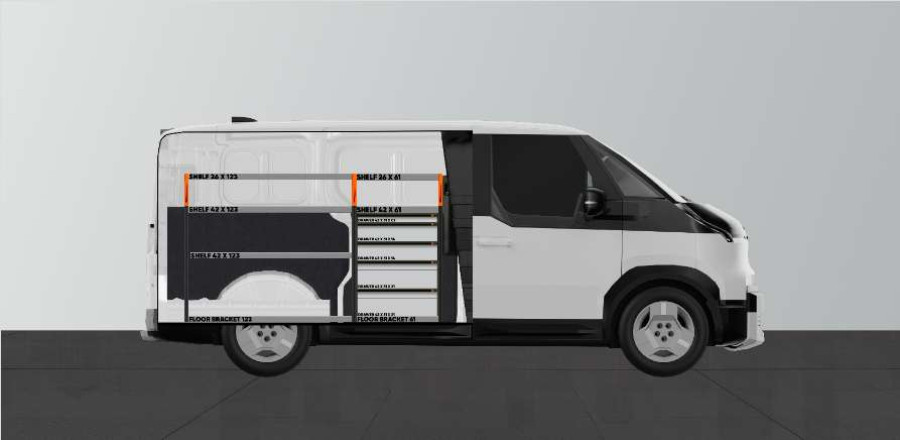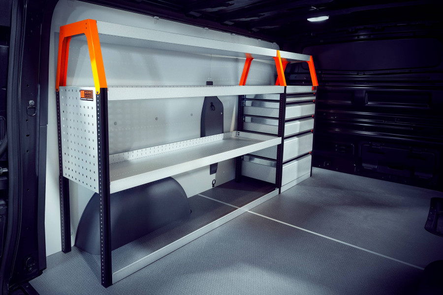 This is one of the most popular systems for KIA PV5 L2H1. The shelf offers good storage options for tool cases and machines, as well as smaller assortments. You get a drawer unit with 5 drawers of varying sizes to give each item its own space. The drawers that go on ball bearing rails are often supplemented with our new drawer inserts and dividers to create the best structure. Complementing the side panels with our Smartboxes is also a popular option for maximizing storage space.