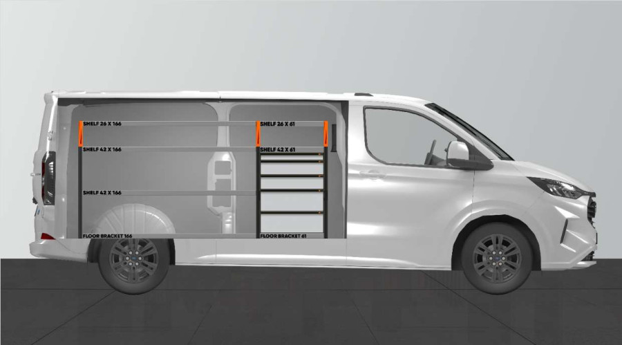 This is one of the most popular systems for Ford Custom & VW Transporter L2. The shelf offers good storage options for tool cases and machines, as well as smaller assortments. You get a drawer unit with 5 drawers of varying sizes to give each item its own space. The drawers that go on ball bearing rails are often supplemented with our new drawer inserts and dividers to create the best structure. Complementing the side panels with our Smartboxes is also a popular option for maximizing storage space.