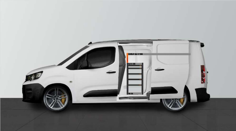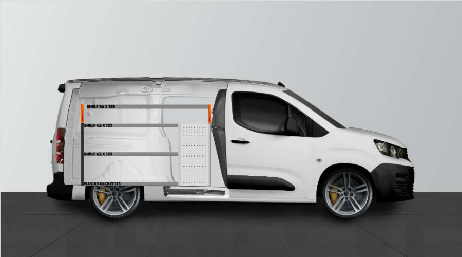 This is one of the most popular systems for Citroën Berlingo, Opel Combo, Fiat Doblo Toyota Proace City & Peugeot Partner L2 with a side door on the side where the shelf is. The shelf provides good storage options for tool cases and machines, as well as smaller assortments. You get a drawer unit with 5 drawers of varying sizes to give each item its own space. Behind the drawers is a tool panel for extra hanging options in the van. The drawers that go on ball bearing rails are often supplemented with our new drawer inserts and dividers to create the best structure. Adding our Smartboxes to the side panels is also a popular option for maximising storage space.