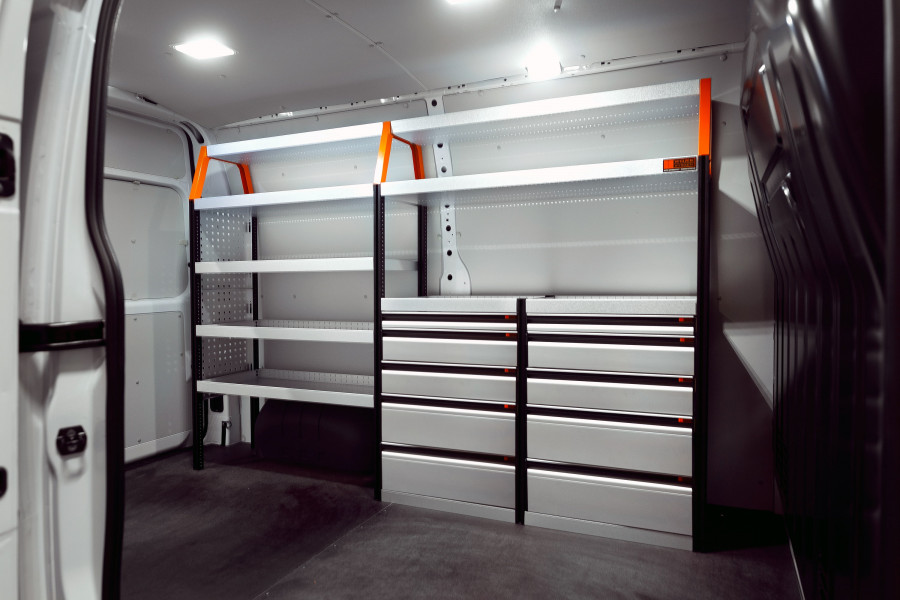 Looking for a shelf with lots of drawers? Do you also have exacting demands for your racking? Then this is the perfect choice for you and your Proace Max, Peugeot Boxer, Fiat Ducato, Citroen Jumper 2010- & Opel Movano 2021- L2. The shelf offers good storage options for tool cases and machines as well as smaller assortments. Has a total of 10x drawers on ball bearing rails. You also get a drawer unit with drawers of varying sizes to give each item its own place. A lot of users like to complement the drawers on ball bearing rails with our drawer inserts and dividers to create the best structure.
