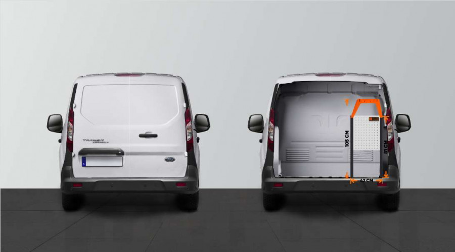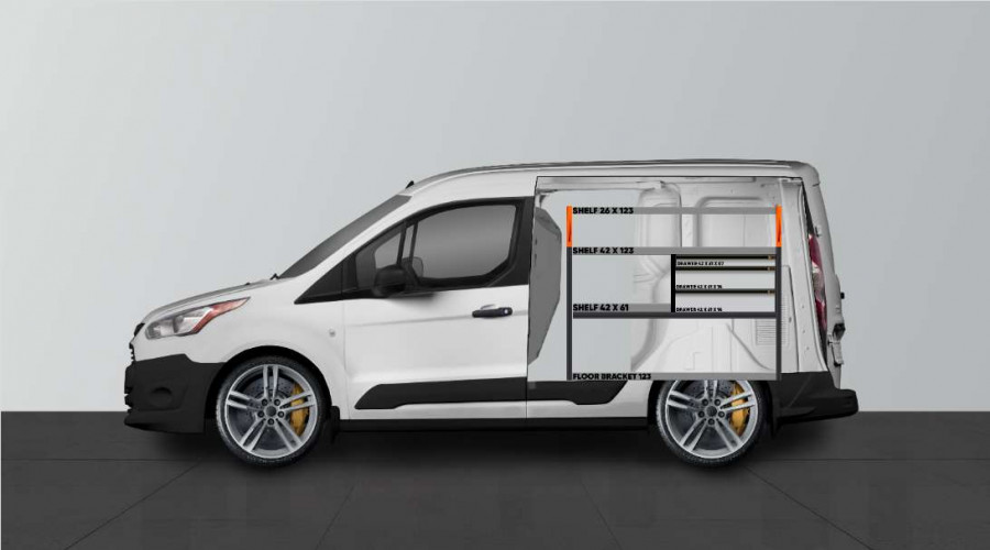 This is one of our most popular van racks for Ford Connect L1. The LS3 shelf is used by caretakers as well as technicians, electricians, plumbers, and carpenters. The shelf offers good storage options for tool cases, machines, consumables, and the smallest assortments. The drawers are often complemented with our drawer inserts and dividers, while users like to add Smartboxes to the side panels to maximize storage space.