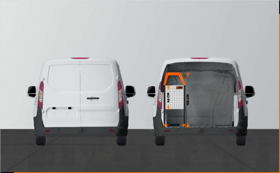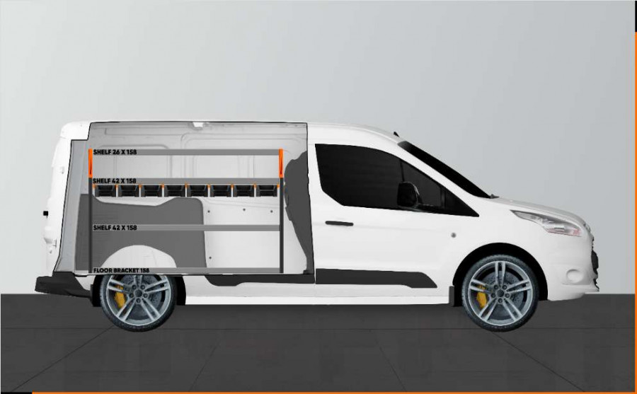 A van rack for users whose first priority is organisation in their Ford Connect L2. This shelf includes 8 of our smart modular boxes. You can easily pull these out with our modular box rails and attach them under the individual shelves. Naturally, there are also good storage options for your tool cases, machines, and materials, as the shelves measure 420 mm in depth.