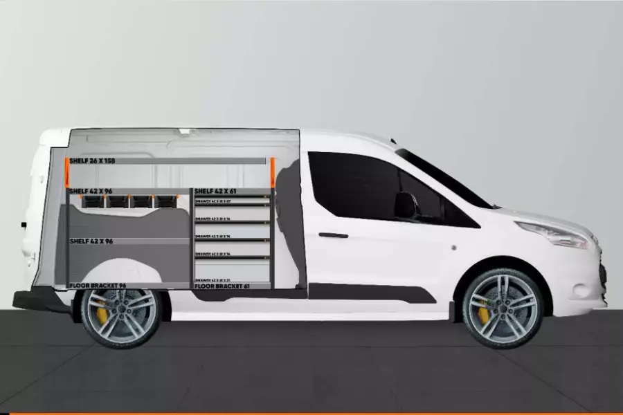 Do you drive a Ford Connect L2? If so, then this is a complete racking for users like yourself with exacting requirements. The shelf provides great storage options for tool cases and machines, as well as smaller assortments. You get a drawer unit with 5 drawers of varying sizes to give each item its own space. This shelf also includes 4 of our modular boxes to properly organise your smaller assortments. A lot of users like to complement the drawers on ball bearing rails with our drawer inserts and dividers to create the best structure.