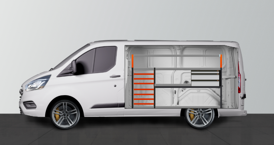 Van Racking with drawers, shelf storage and assortment holders that fit the Ford Transit Custom L1H1.