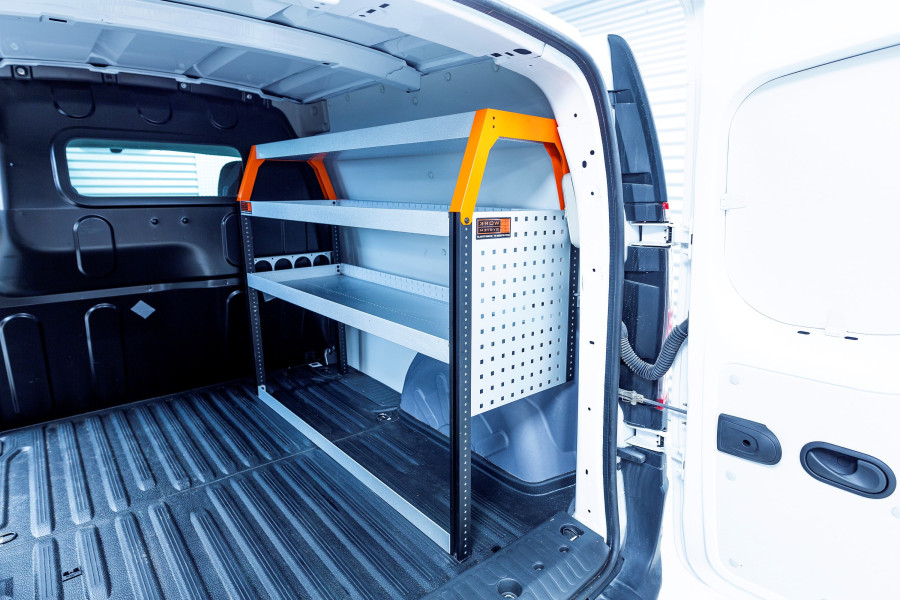 A van rack for your Dacia Dokker & Renault Express L1 that provides good storage options for tool cases and machines as well as smaller assortments. The shelves of the racking have a depth of 420 mm so most tool cases on the market fit perfectly. The top shelf of 262.5 mm is often supplemented with our modular boxes so smaller assortments have their own space. The side panels offer room for additional accessories like Smartboxes and hooks.