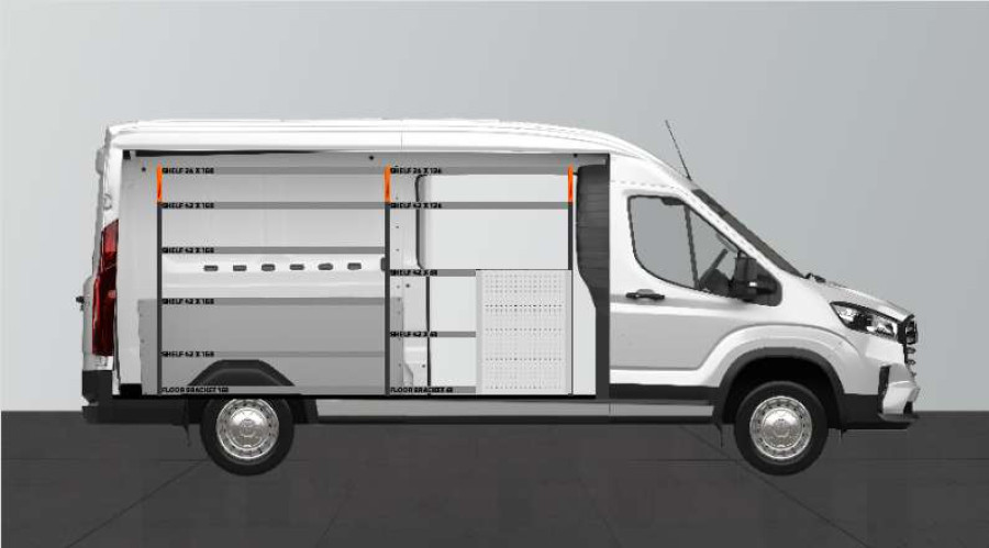 This is one of the most popular systems for Maxus e-Deliver9 L3 with a side door on the side where the shelf is. The shelf provides good storage options for tool cases and machines, as well as smaller assortments. You get a drawer unit with 5 drawers of varying sizes to give each item its own space. Behind the drawers is a tool panel for extra hanging options in the van. The drawers that go on ball bearing rails are often supplemented with our new drawer inserts and dividers to create the best structure. Adding our Smartboxes to the side panels is also a popular option for maximising storage space.