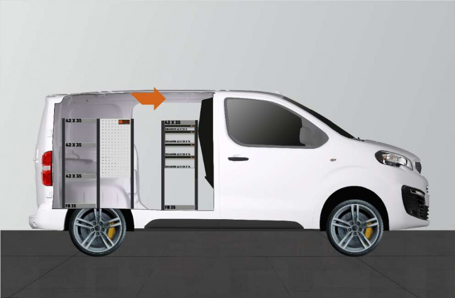 One of the most popular van racks for your Peugeot Expert, Citroën Jumpy, Opel Vivaro, Fiat Scudo & Toyota ProAce L1. The rack provides variable storage options as the drawers on the ball bearing rails provide easy access via the side door, while the drawers can be pulled out in the direction of travel for a good overview. These can be supplemented with drawer dividers to maximise the structure for a smaller assortment. Our deep shelves also offer good storage options for tool cases as well as smaller machines. Distributed load weight in the drawers is 35 kg each. The internal dimensions of the drawers are (mm) W-308, D-387, H-60 and H-130.