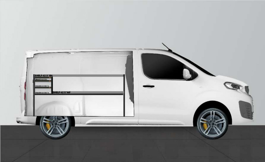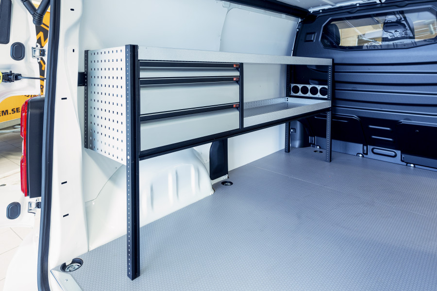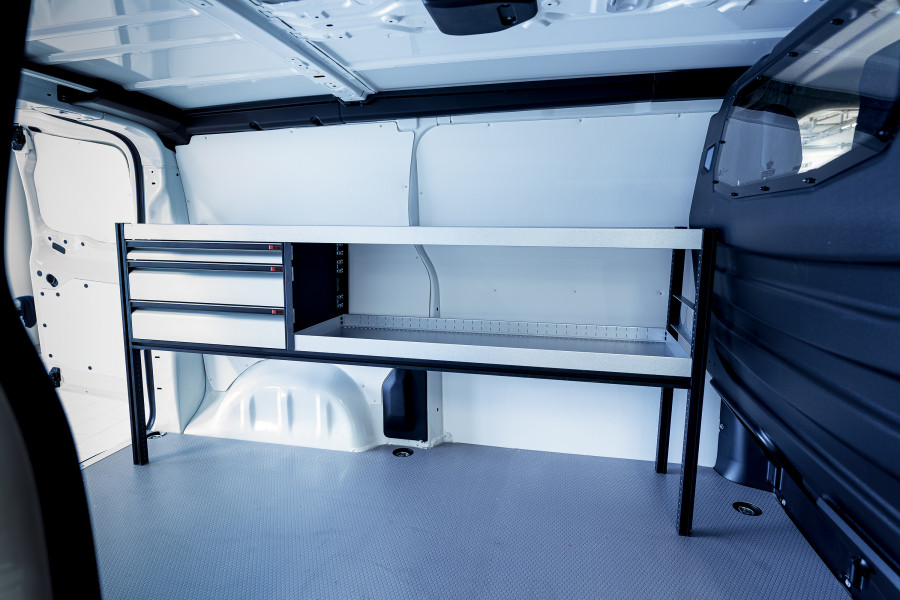 A cost-effective alternative for users with simpler needs regarding storage and who want a combination of drawers on ball bearing rails as well as shelves for their Peugeot Expert, Citroën Jumpy, Opel Vivaro, Fiat Scudo & Toyota ProAce L2. The shelf is 420 mm deep, so most tool cases on the market fit perfectly. A lot of users like to add our drawer inserts and dividers, which give you a great opportunity to organise a smaller assortment.