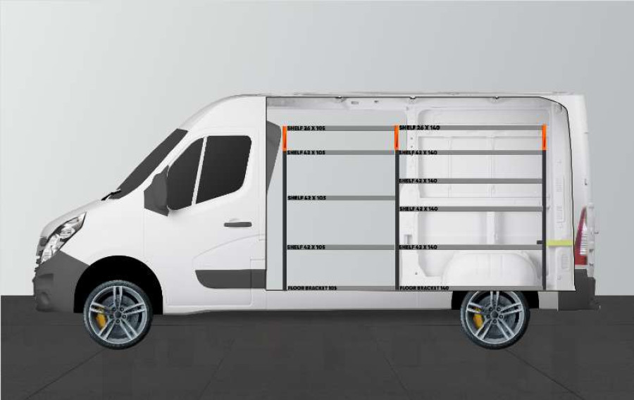 A van rack for your Opel Movano, Renault Master och Nissan NV400 that provides good storage options for tool cases and machines as well as smaller assortments. The shelves of the racking have a depth of 420 mm so most tool cases on the market fit perfectly. The top shelf of 262.5 mm is often supplemented with our modular boxes so smaller assortments have their own space. The side panels offer room for additional accessories like Smartboxes and hooks.