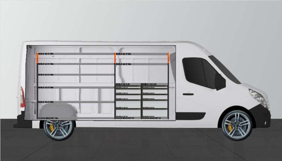 Looking for a shelf with lots of drawers? Do you also have exacting demands for your racking? Then this is the perfect choice for you and your Opel Movano, Renault Master & Nissan NV400 L3. The shelf offers good storage options for tool cases and machines as well as smaller assortments. Has a total of 10x drawers on ball bearing rails. You also get a drawer unit with drawers of varying sizes to give each item its own place. A lot of users like to complement the drawers on ball bearing rails with our drawer inserts and dividers to create the best structure.