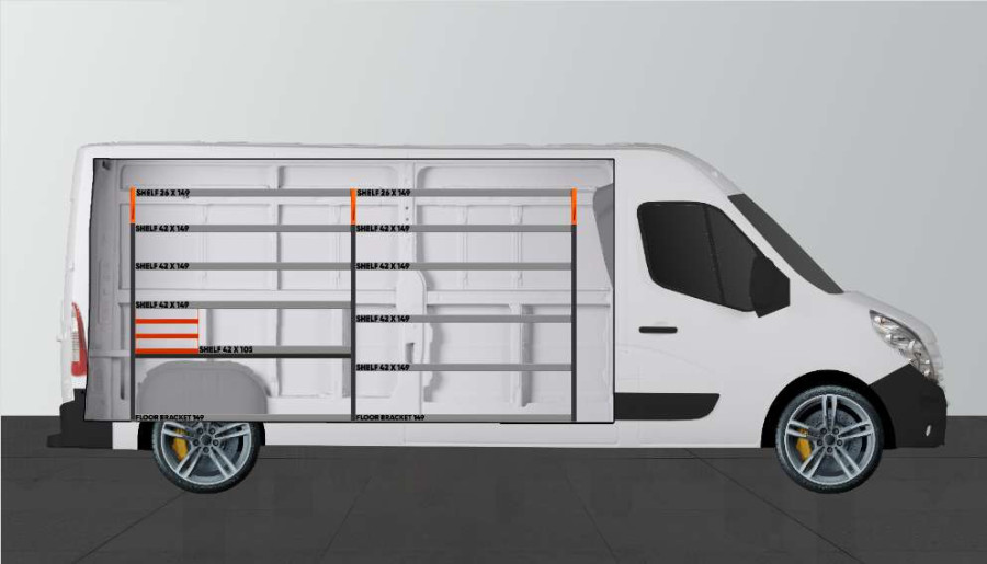 A popular shelf for users who need good storage options for a smaller assortment, as well as tool cases and machines. This van racking contains 3 assortmentbox holders that are adapted for one of the market’s most popular assortment box, Racco Carrylight. The rack can be supplemented with the assortment boxes if required. The shelf suits your Opel Movano, Renault Master & Nissan NV400 L3 perfectly.