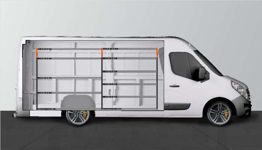 A van rack for your Opel Movano, Renault Master & Nissan NV400 that provides good storage options for tool cases and machines as well as smaller assortments. The shelves of the racking have a depth of 420 mm so most tool cases on the market fit perfectly. The top shelf of 262.5 mm is often supplemented with our modular boxes so smaller assortments have their own space. The side panels offer room for additional accessories like Smartboxes and hooks.