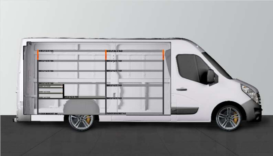 This is one of our most popular van racks for Opel Movano, Renault Master & Nissan NV400. The LS3 shelf is used by caretakers as well as technicians, electricians, plumbers, and carpenters. The shelf offers good storage options for tool cases, machines, consumables, and the smallest assortments. The drawers are often complemented with our drawer inserts and dividers, while users like to add Smartboxes to the side panels to maximize storage space.