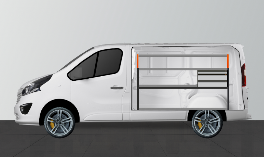 This is one of our most popular van racking units for the Talento, NV300, Vivaro & Trafic L1H1. The LS3 provides you with good storage for both your tool bags, cases, machines, and small components. The drawers on the racking are a popular complement to our new assortment boxes. Why not complement the shelf frame of the racking with our new Smartbox which is a popular option for maximizing storage space. The maximum bearing weight of the drawers in the ball bearing rails is 50kg per drawer. The interior dimensions of the drawers are (mm) B-579, D-374, H-60 and H-130.