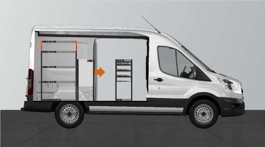 Van rack with easy access to drawers with ball bearing slides by the side door of the Ford Transit L2H2.