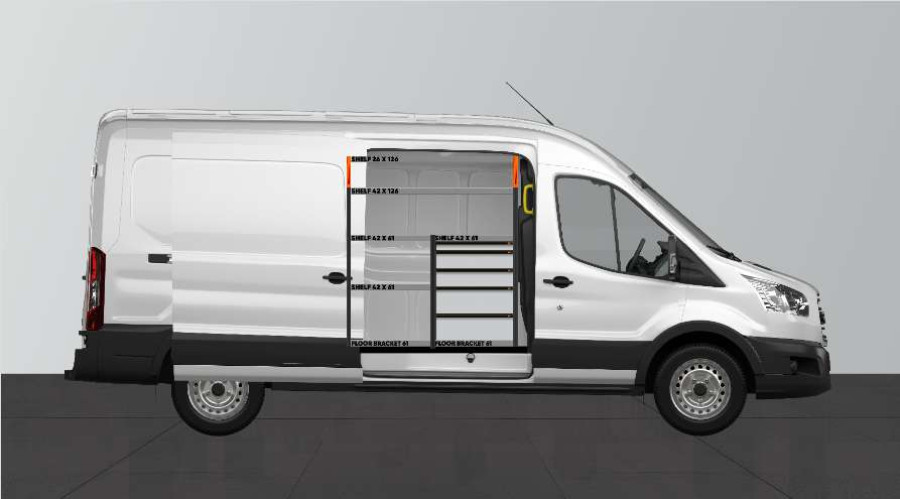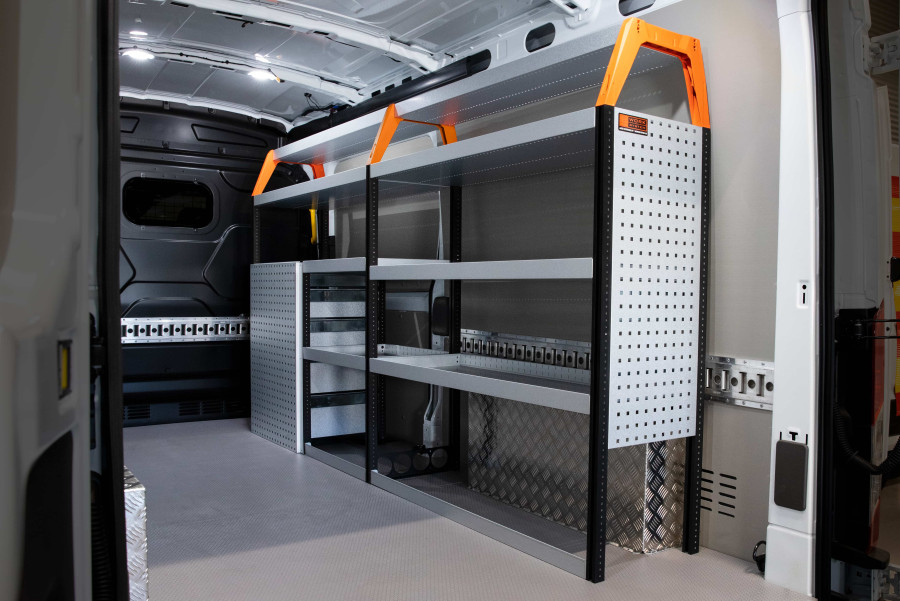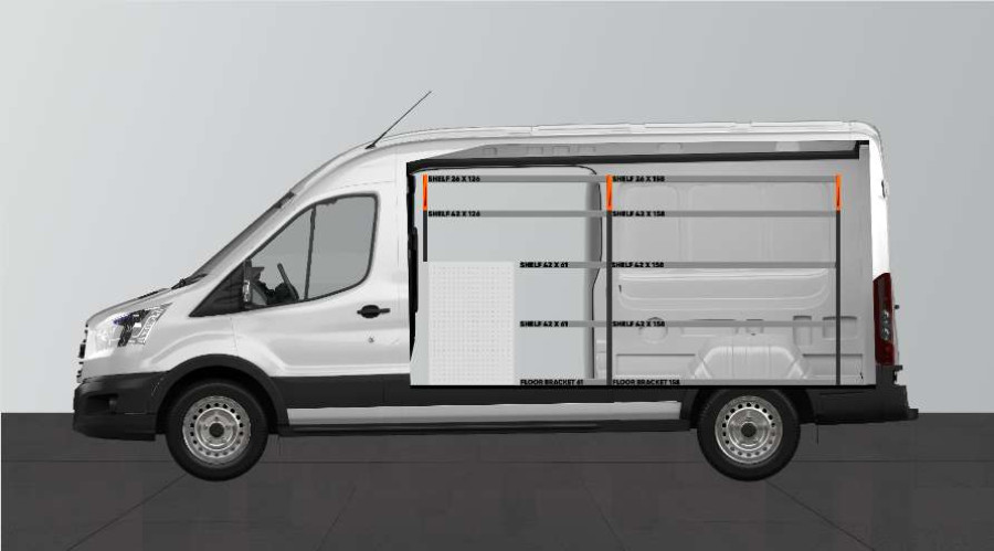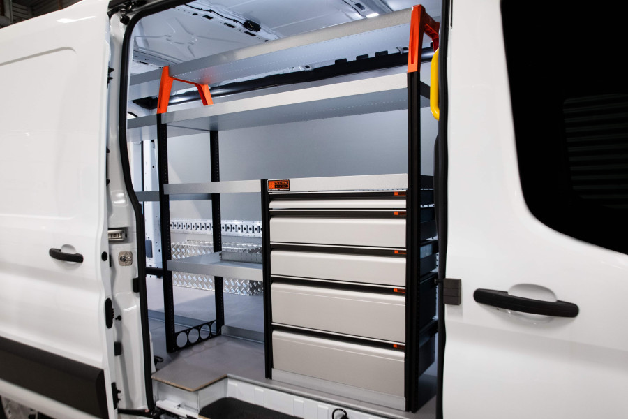 This is one of the most popular systems for Ford Transit L3H2 with a side door on the side where the shelf is. The shelf provides good storage options for tool cases and machines, as well as smaller assortments. You get a drawer unit with 5 drawers of varying sizes to give each item its own space. Behind the drawers is a tool panel for extra hanging options in the van. The drawers that go on ball bearing rails are often supplemented with our new drawer inserts and dividers to create the best structure. Adding our Smartboxes to the side panels is also a popular option for maximising storage space.