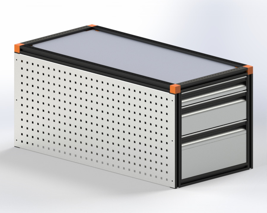 a tool panel on the side of the drawer unit and also a work surface on top of the drawer unit for increased loading & storage options.
