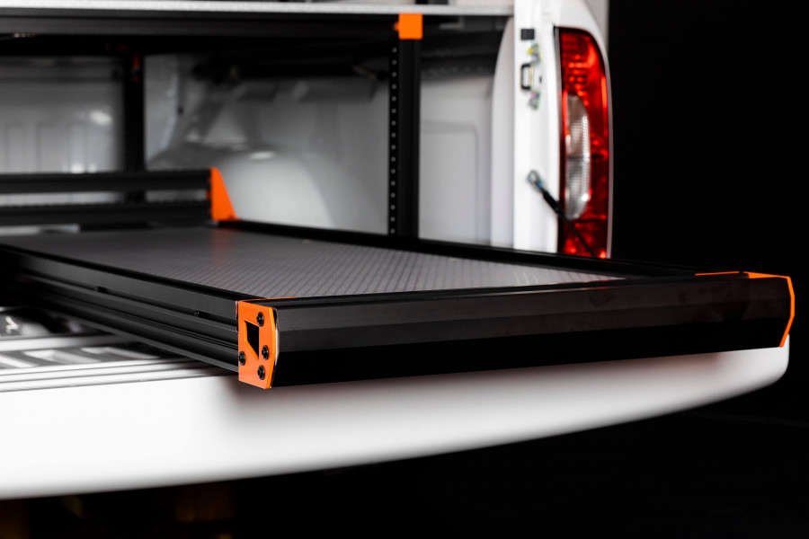 Maximise the reach inside your cargo space with a slide that pulls out. It optimises the working environment by ensuring that even heavy cargo such as tools can be pulled out and lifted from the vehicle in an ergonomically correct manner. The entire construction is made of black anodised high-strength aluminium with powder-coated steel fasteners and therefore is very low in weight to reduce the impact of the total load weight. Thanks to a totally modular concept, we can offer the right slide for your exact vehicle and needs. The slide is easily pulled out with just one hand by pressing in the locking handle while pulling the slide outwards. Spring-loaded locks and several steps along the extension length ensure that the slide stops quickly while you are loading, even if the vehicle is parked on an incline. With a wide range of accessories, you can add to your slide for the ideal interior.
